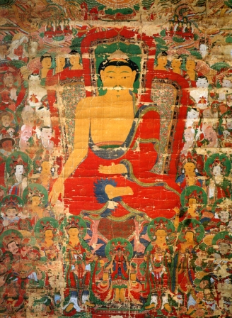 ¼®°¡¿©·¡ÀÇ ÁÖº¯¿¡´Â ÆÈ´ëº¸»ì°ú ¹ü•Á¦¼®Ãµ, ½Ê´ëÁ¦ÀÚ, »çõ¿Õ, ÆÈºÎÁß µîÀÌ º»Á¸À» ¿¡¿ö½Î¸ç Á¿ì´ëĪÀÇ ±¸µµ¸¦ º¸À̰í ÀÖ´Ù. º»Á¸ÀÌ Çù½Ãº¸»ì°ú ±Ç¼Óµé¿¡ ºñÇØ µÎµå·¯Áö°Ô Å©°Ô Ç¥ÇöµÇ¾î ÀÖ¾î ȸéÀ» ¾ÐµµÇϰí ÀÖ´Ù. ¶Ç ÇÏ´Ü Áß¾Ó¿¡´Â ¼®°¡¸ð´Ï¿¡°Ô ¹°À½À» ûÇÏ´Â µÞ¸ð½ÀÀÌ ±×·ÁÁø ³ôÀº º¸°üÀ» ¾´ º¸»ìÇü û¹®ÀÚ°¡ µîÀåÇϰí ÀÖ¾î ÁÖ¸ñµÈ´Ù. ä»öÀº ÁÖ»ö, ³ì»ö, ȲÅä µîÀ» ÁÖÁ¶»öÀ¸·Î Ȱ¿ëÇÏ¿© ÀüüÀûÀ¸·Î ¹à°í ¾ÈÁ¤µÈ ´À³¦À» ÁÖ°í ÀÖ´Ù. º»Á¸À» ¿¡¿ö½Ñ ±¤¹è ³»ºÎÀÇ ¹®¾çÀ» ºñ·ÔÇÏ¿© È¸é ³»ºÎ¿¡ ½Ã¹®µÈ ¿©·¯ ¹®¾çµéÀÌ ¼¼¹ÐÇϰí È·ÁÇÑ ÆíÀÌ´Ù.