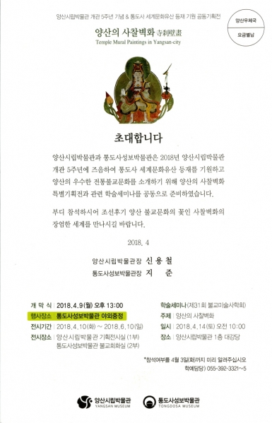 | <Ưº°Àü> ¾ç»êÀÇ »çÂûº®È (TEMPLE MURAL PAINTINGS IN YANGSAN-CITY) Åëµµ»çÀÇ ¼¼°è¹®ÈÀ¯»ê µîÀç ±â¿ø°ú ¾ç»ê½Ã¸³¹Ú¹°°ü °³°ü 5ÁÖ³âÀ» ¸Â¾Æ ¾ç»êºÒ±³¹®ÈÀÇ ¿ì¼ö¼º°ú µ¶Ã¢¼ºÀ» ¼Ò°³Çϱâ À§ÇØ ¡®¾ç»êÀÇ »çÂûº®È¡¯¸¦ ÁÖÁ¦·Î ÇÑ Æ¯º°±âȹÀüÀÌ 2018³â 4¿ù 10ÀÏ(È)ºÎÅÍ 6¿ù 10ÀÏ(ÀÏ)±îÁö °øµ¿ °³ÃÖ µÈ´Ù. ¾ç»ê(ÕÙߣ)Àº 646³â(¼±´ö¿©¿Õ 15)¿¡ ÀÚÀåÀ²»ç¿¡ ÀÇÇØ â°ÇµÈ õ³â°íÂû Åëµµ»ç¸¦ Áß½ÉÀ¸·Î ¸¹Àº ÀüÅë»çÂûµéÀÌ ¸ð¿© ÀÖ´Â À¯¼ ±íÀº ºÒ±³¹®ÈÀÇ °íÀåÀÌ´Ù. ¶ÇÇÑ Åëµµ»ç¿Í ½ÅÈï»ç¿¡´Â ¼ö¸¹Àº Àü¼³°ú ´Ù¼öÀÇ º¸¹°±Þ ºÒ±³ ¹®ÈÀç°¡ ³²¾Æ ÀÖÀ¸¸ç, ƯÈ÷ ºÒ±³ °æÀü°ú ±³¸®ÀÇ ³»¿ëÀ» ±×¸²À¸·Î ³²±ä »çÂûº®È¿Í ¿©·¯ ºÒ±³È¸È¸¦ ¼ÒÀåÇϰí ÀÖ´Ù. »çÂûº®È(ÞÑóËÛú畫)´Â »ç¿ø °Ç¹° ³»¡¤¿Ü º®¸é°ú ¿©·¯ ºÎÀç¿¡ ºÒ±³ÀÇ ±³¸®¿Í »ç»ó¿¡ µû¶ó ±×·ÁÁø ±×¸²À¸·Î½á º®È ÀÚü°¡ °ø°£ÀÇ Áß¿äÇÑ ¿ä¼Ò°¡ µÇ¸ç ¹èÄ¡¿Í ±¸¼º¿¡ µû¶ó ¿¹¹èÀÇ ´ë»óÀÌ µÇ°Å³ª, ´ÜûÀ» ÅëÇÑ Àå½ÄÀÇ ¿ªÇÒµµ ¼öÇàÇÏ¿´´Ù. À̹ø Ưº°Àü½Ã´Â »çÂûº®È°¡ ±×·ÁÁø À§Ä¡»ó Æò¼Ò¿¡ °¡±õ°Ô Á¢ÇÏÁö ¸øÇÏ¿© »çÂûº®È ¸ð»çº»°ú °íÈÁú À̹ÌÁö, °¢Á¾ ÇöȲ¿¡ ´ëÇÑ ÀÚ·á µîÀ» ÅëÇØ ¾ç»ê »çÂûº®È¿¡ ´ëÇÑ ¿ª»ç¼º°ú ¿¹¼ú¼ºÀ» ÇÑÀÚ¸®¿¡¼ °¨»óÇÒ ¼ö ÀÖµµ·Ï ÇÏ´Â °Í¿¡ ÀÇÀǰ¡ ÀÖ´Ù. À̹ø Ưº°Àü½Ã¸¦ ÅëÇØ ¾ç»ê ºÒ±³¹®È¿¡ ´ëÇÑ ¿ì¼ö¼º°ú ÇмúÀû °¡Ä¡°¡ ³Î¸® ¾Ë·ÁÁö°í Èļ¼¿¡ ¿Ã¹Ù¸£°Ô ÀüÇØÁú ¼ö ÀÖ´Â °è±â°¡ µÇ±æ ¹Ù¶õ´Ù. 1. Àü ½Ã ¸í : ¾ç»êÀÇ »çÂûº®È Ưº°±âȹÀü 2. Àü½Ã±â°£ : 2018³â 4¿ù 10ÀÏ(È) ¡ 2018³â 6¿ù 10ÀÏ(ÀÏ) 3. °³ ¸· ½Ä : 2018³â 4¿ù 9ÀÏ(¿ù) ¿ÀÈÄ 1½Ã (Åëµµ»ç¼ºº¸¹Ú¹°°ü) 4. Àü½ÃÀå¼Ò : Åëµµ»ç¼ºº¸¹Ú¹°°ü 2Ãþ ºÒ±³È¸È½Ç ¹× ±âȹÀü½Ã½Ç / ¾ç»ê½Ã¸³¹Ú¹°°ü ±âȹÀü½Ã½Ç 5. ÁÖ ÃÖ : °øµ¿ÁÖÃÖ / Åëµµ»ç¼ºº¸¹Ú¹°°ü¡¤¾ç»ê½Ã¸³¹Ú¹°°ü  ¾ç»ê Åëµµ»ç ¿µ»êÀü º®È <°ßº¸Å¾Ç°µµ> 18¼¼±âÃÊ, (400¡¿230) ¾ç»ê ½ÅÈï»ç ´ë±¤Àü º®È <¾Æ¹ÌŸ»ïÁ¸µµ> 17¼¼±âÈĹÝ, (229¡¿342.5) ¾ç»ê ½ÅÈï»ç ´ë±¤Àü º®È <À°´ëº¸»ìµµ> 17¼¼±âÈĹÝ, (195¡¿342.5) ¾ç»ê ½ÅÈï»ç ´ë±¤Àü º®È <»çõ¿Õµµ> 17¼¼±âÈĹÝ, (155¡¿335) |