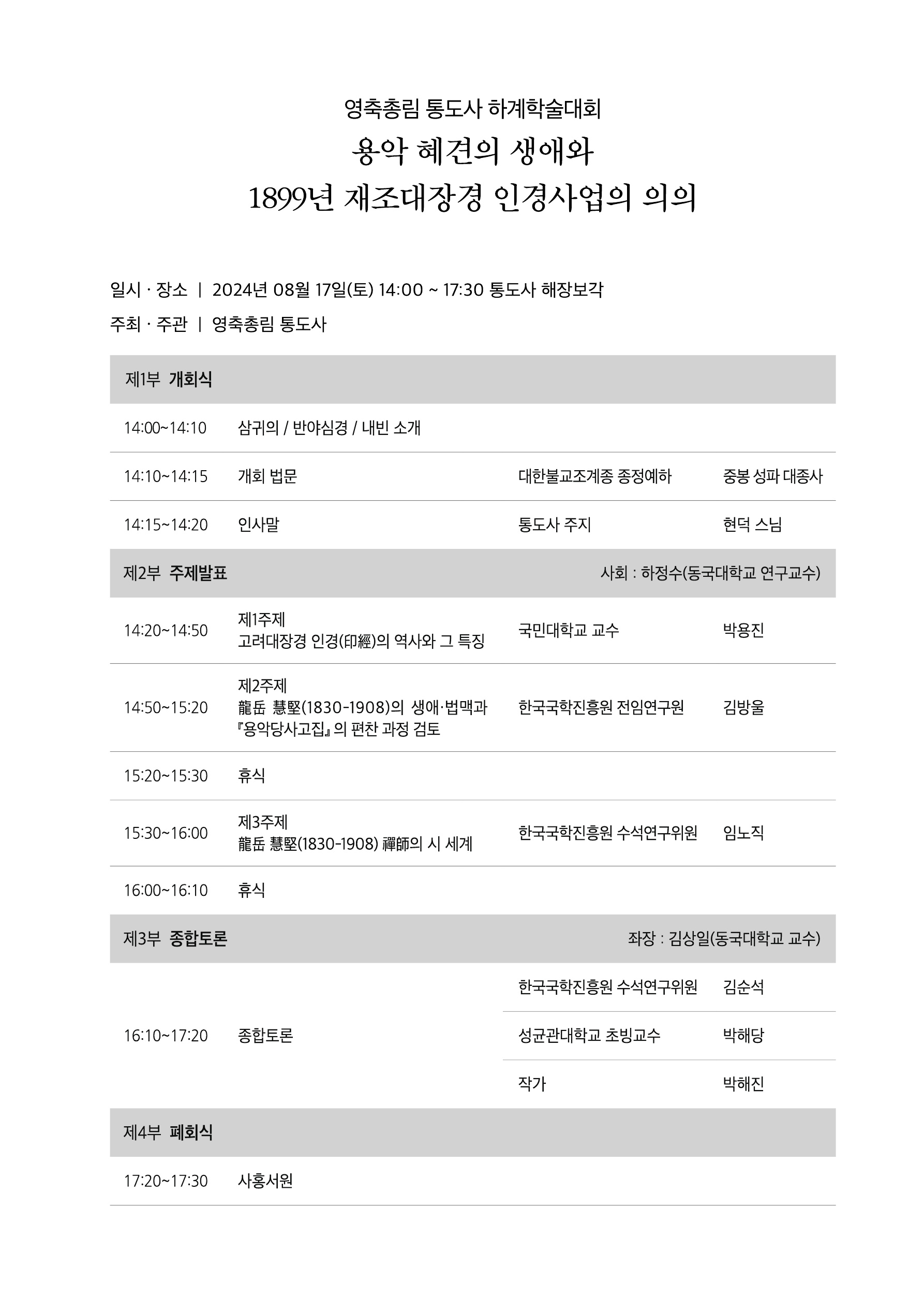 ´ëÇѺұ³Á¶°èÁ¾ Á¾Á¤ ¿¹ÇÏÀ̽ŠÁߺÀ ¼ºÆÄ ´ëÁ¾»çÀÇ °³È¸ ¹ý¹®°ú Åëµµ»ç ÁÖÁö Çö´ö ½º´ÔÀÇ Àλ縻¿¡ À̾î ÁÖÁ¦¹ßÇ¥ ¡â °í·Á´ëÀå°æ Àΰæ(ìÔÌè)ÀÇ ¿ª»ç¿Í ±× Ư¡(¹Ú¿ëÁø ±¹¹Î´ëÇб³ ±³¼ö), ¡â ¿ë¾Ç Çý°ß(1830-1908)ÀÇ »ý¾Ö¡¤¹ý¸Æ°ú ¡º¿ë¾Ç´ç»ç°íÁý¡» ÀÇ ÆíÂù °úÁ¤ °ËÅä(±è¹æ¿ï Çѱ¹±¹ÇÐÁøÈï¿ø ÀüÀÓ¿¬±¸¿ø), ¡â ¿ë¾Ç Çý°ß(1830-1908) ¼±»çÀÇ ½Ã ¼¼°è(ÀÓ³ëÁ÷, Çѱ¹±¹ÇÐÁøÈï¿ø ¼ö¼®¿¬±¸À§¿ø)¿Í Á¾ÇÕÅä·ÐÀÌ À̾îÁý´Ï´Ù.