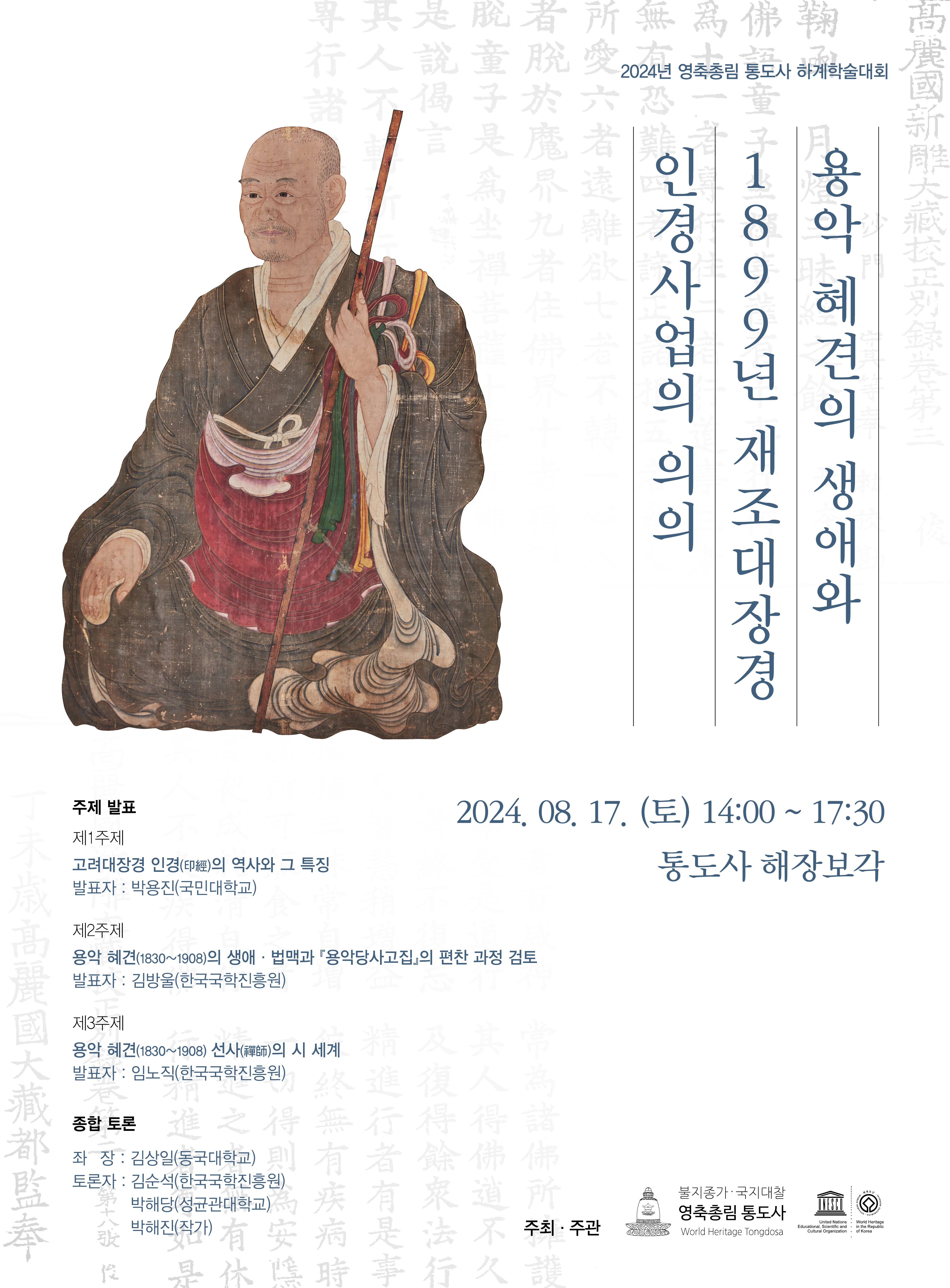 ¿ë¾Ç Çý°ß(×£ä¿ û´Ì±, 1830~1908)ÀÇ ¿ø·ÂÀ¸·Î 1899³â(±¤¹« 3)¿¡ ÀÌ·ç¾îÁø °í·ÁÀçÁ¶´ëÀå°æ(ÀÌÇÏ ÆÈ¸¸´ëÀå°æ) ÀÎ°æ ºÀ¾È »ç¾÷ÀÇ ¿ª»çÀû ÀÇÀǸ¦ Á¶¸íÇϱâ À§ÇØ ¸¶·ÃÇÑ À̹ø Çмú´ëȸ´Â °í·Á½Ã´ëºÎÅÍ ´ëÇÑÁ¦±¹¿¡ À̸£±â±îÁö ºÒ±³°èÀÇ ¿°¿ø°ú ¿ª»ç°¡ ´ã±ä ÆÈ¸¸´ëÀå°æ ÀÎ°æ ºÒ»ç¸¦ Áß½ÉÀ¸·Î, ´ç½Ã ºÒ±³°èÀÇ Á¤½ÅÀû¡¤°æÁ¦Àû Çå½ÅÀ» ¹àÈ÷´Â ÀÚ¸®°¡ µÉ °ÍÀÔ´Ï´Ù.