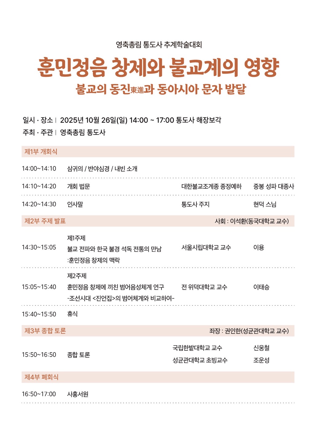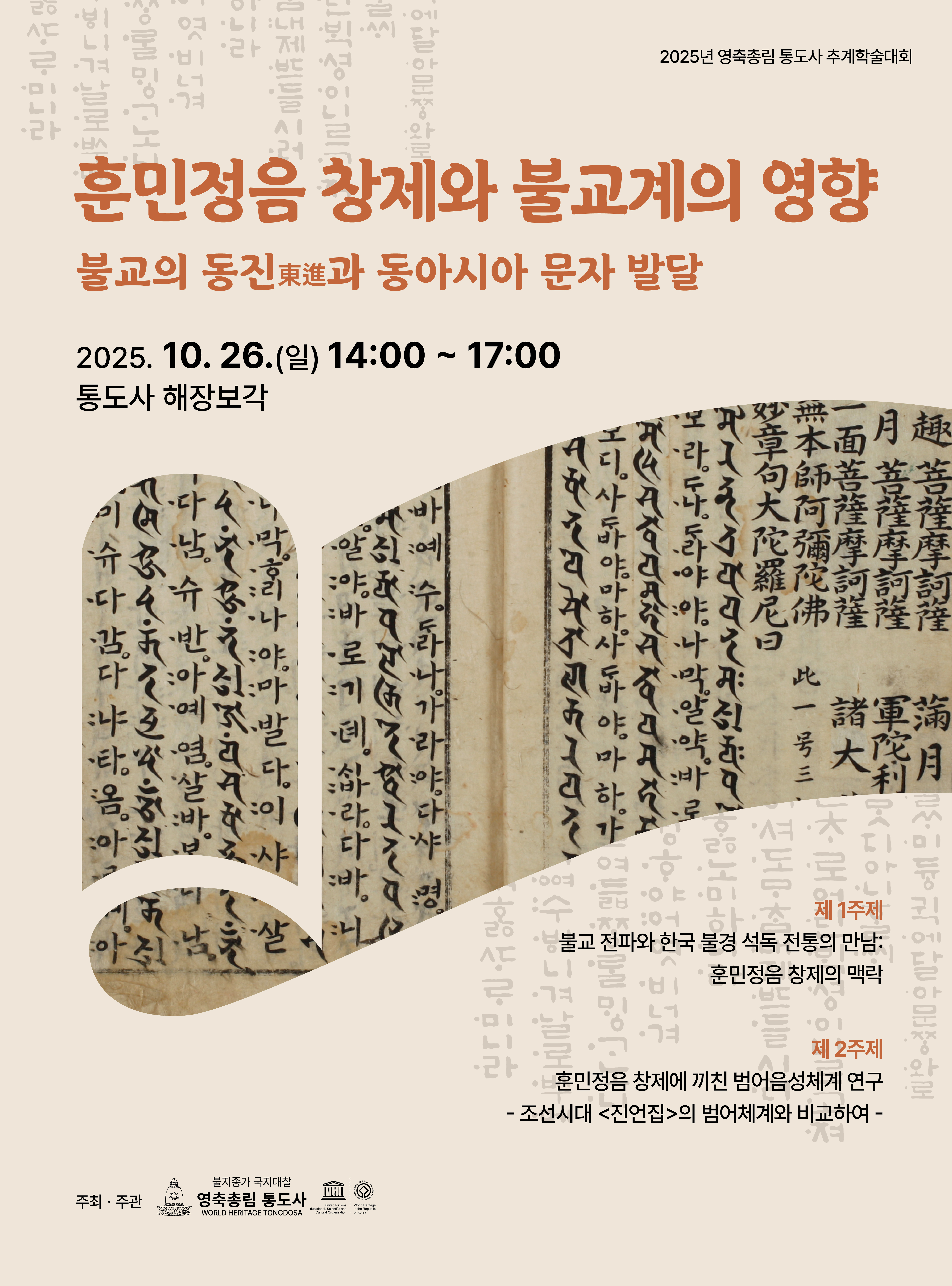 2025³â ¿µÃàÃѸ² Åëµµ»ç Ãß°èÇмú´ëȸ ¡°ÈƹÎÁ¤À½ âÁ¦¿Í ºÒ±³°èÀÇ ¿µÇâ – ºÒ±³ÀÇ µ¿ÁøÔÔòä°ú µ¿¾Æ½Ã¾Æ ¹®ÀÚ ¹ß´Þ¡± °³ÃÖ ´ëÇѺұ³Á¶°èÁ¾ Á¦15±³±¸ º»»ç ¿µÃàÃѸ² Åëµµ»ç(ÁÖÁö Çö´ö)´Â ¿À´Â 10¿ù 26ÀÏ(ÀÏ) Åëµµ»ç ÇØÀ庸°¢¿¡¼ <2025³â ¿µÃàÃѸ² Åëµµ»ç Ãß°èÇмú´ëȸ ÈÆ¹ÎÁ¤À½ âÁ¦¿Í ºÒ±³°èÀÇ ¿µÇâ - ºÒ±³ÀÇ µ¿Áø(ÔÔòä)°ú µ¿¾Æ½Ã¾Æ ¹®ÀڹߴÞ>À» °³ÃÖÇÑ´Ù. À̹ø Çмú´ëȸ¿¡¼´Â ÀüÅë»çȸÀÇ ¹®ÀÚ¼ö¿ë°ú ºÒ±³ Àü·¡ÀÇ °ü·Ã¼º¿¡ ´ëÇØ Á¶¸íÇÑ´Ù. ´ëÇѺұ³Á¶°èÁ¾ Á¾Á¤ ¿¹ÇÏÀ̽ŠÁߺÀ ¼ºÆÄ ´ëÁ¾»ç´Â ÀÏÂïºÎÅÍ »õ·Î¿î ¹®ÀÚÀÎ ÈÆ¹ÎÁ¤À½ âÁ¦¿¡ ºÒ±³°è ½Å¹Ì¡¤ÇÐÁ¶¡¤Çп°ú °°Àº ½Â·ÁµéÀÌ ±íÀÌ °ü¿©ÇÏ¿´´Ù´Â »ç½Ç¿¡ ÁÖ¸ñÇÏ¿´°í, À̸¦ Àü¹® ÇÐÀÚÀÇ ¿¬±¸¸¦ ÅëÇØ ³Î¸® ¾Ë¸®°íÀÚ ÇÏ¿´´Ù. <2025³â ¿µÃàÃѸ² Åëµµ»ç Ãß°èÇмú´ëȸ ÈÆ¹ÎÁ¤À½ âÁ¦¿Í ºÒ±³°èÀÇ ¿µÇâ - ºÒ±³ÀÇ µ¿Áø(ÔÔòä)°ú µ¿¾Æ½Ã¾Æ ¹®Àڹߴޡµ ¿¡¼´Â ¡ã ¼¿ï½Ã¸³´ëÇб³ ÀÌ¿ë ±³¼ö°¡ <ºÒ±³ ÀüÆÄ¿Í Çѱ¹ ºÒ°æ ¼®µ¶ ÀüÅëÀÇ ¸¸³²: ÈÆ¹ÎÁ¤À½ âÁ¦ÀÇ ¸Æ¶ô>, ¡ã Àü À§´ö´ë ÀÌŽ ±³¼ö°¡ <ÈÆ¹ÎÁ¤À½ âÁ¦¿¡ ³¢Ä£ ¹ü¾îÀ½¼ºÃ¼°è ¿¬±¸-Á¶¼±½Ã´ë <Áø¾ðÁý>ÀÇ ¹ü¾îü°è¿Í ºñ±³ÇÏ¿©->¶ó´Â ÁÖÁ¦·Î ¹ßÇ¥ÇÑ´Ù. Åä·ÐÀڷδ ±¹¸³Çѹç´ë ½Å¿õö ±³¼ö, ¼º±Õ°ü´ëÇб³ Á¶¿î¼º ±³¼ö°¡ °¢°¢ ¸Ã¾Æ¼ ÁøÇàÇÑ´Ù. ¿ÃÇØ·Î ¼¼ ¹øÂ° °³ÃֵǴ À̹ø Çмú´ëȸ´Â ºÒ±³°è¿Í ÇÑ±Û Ã¢Á¦°¡ ¹ÐÁ¢ÇÑ °ü·ÃÀÌ ÀÖÀ¸¸ç, ÈÆ¹ÎÁ¤À½ Áï ÇѱÛÀÇ ¹®ÀÚü°è¿Í À½¿îü°è¸¦ »õ·Ó°Ô ÀÌÇØÇÏ´Â °è±â°¡ µÉ °ÍÀ¸·Î ±â´ëµÈ´Ù. ƯÈ÷, ÈÆ¹ÎÁ¤À½ âÁ¦¿¡ ºÒ±³°è°¡ Áö´ëÇÑ ¿ªÇÒÀ» ÇÏ¿´´Ù´Â »ç½ÇÀº ÀÏ¹Ý ´ëÁߵ鿡°Ô´Â ¾ÆÁ÷ ÀÏ¹Ý ´ëÁß¿¡°Ô ³Î¸® ¾Ë·ÁÁöÁö ¾ÊÀº ºÎºÐÀ¸·Î À̹ø Çмú´ëȸ¸¦ ÅëÇØ °ü·Ã ¿¬±¸ÀÇ »çȸÀû °ø°¨´ë¸¦ È®»ê½ÃŰ´Â °è±â¸¦ ¸¶·ÃÇϰíÀÚ ÇÑ´Ù. À̹ø <2025³â ¿µÃàÃѸ² Åëµµ»ç Ãß°èÇмú´ëȸ ÈÆ¹ÎÁ¤À½ âÁ¦¿Í ºÒ±³°èÀÇ ¿µÇâ - ºÒ±³ÀÇ µ¿Áø(ÔÔòä)°ú µ¿¾Æ½Ã¾Æ ¹®Àڹߴޡµ¿¡ °ü½ÉÀÖ´Â ºÐµéÀÇ ¸¹Àº Âü¿© ºÎʵ右´Ï´Ù.